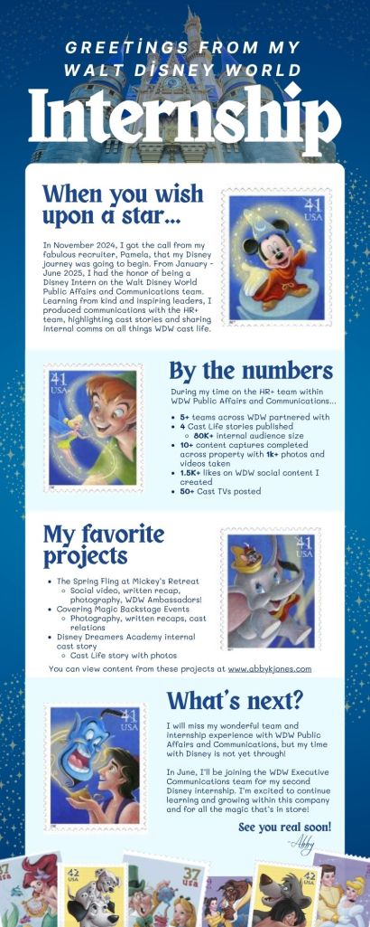 I’m proud to have launched my post-grad career in 2025 with The Walt Disney Company, joining the Walt Disney World Public Affairs and Communications team through two internships. Throughout the year, I developed key skills in maintaining and elevating an unmatched brand reputation through strategic internal and external communications at the site level.